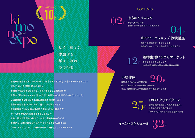全国有名産地の作り手さんから話を聞いたり、和小物づくり講座、お手入れのプロに相談できるクリニックに、EXPOだけのスペシャルセールなど、好きが深まる楽しさが広がる多彩な内容で、今回は10周年の特別企画も!