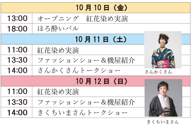 米沢を代表する機屋さんの新作や品評会上位入選作の展示販売、きものファッションショーに紅花染の実演、トークショーは随筆家イラストレーターきくちいまさん、きものインフルエンサーさんかくさん。今年は、ほろ酔い夜のみ会も♪